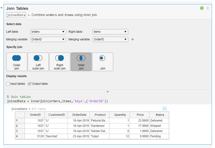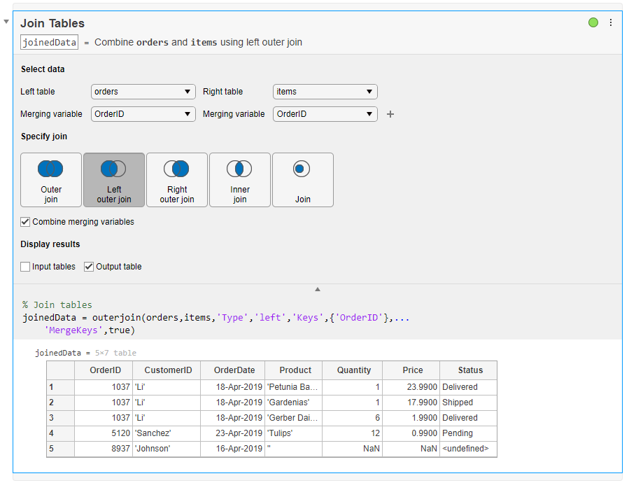 Задача Объединяющих таблиц позволяет вам в интерактивном режиме объединить две таблицы путем выполнения соединений или путем конкатенации таблиц горизонтально или вертикально. Задача автоматически генерирует код MATLAB® для вашего live скрипта.