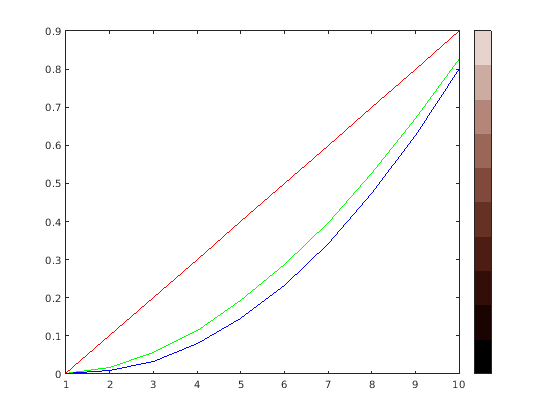 r = (0:.1:.9)'; g = r.^1.8; b = r.^2.1; mymap = [r g b]; rgbplot(mymap) hold on colormap(mymap) colorbar('Ticks',[])