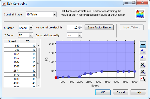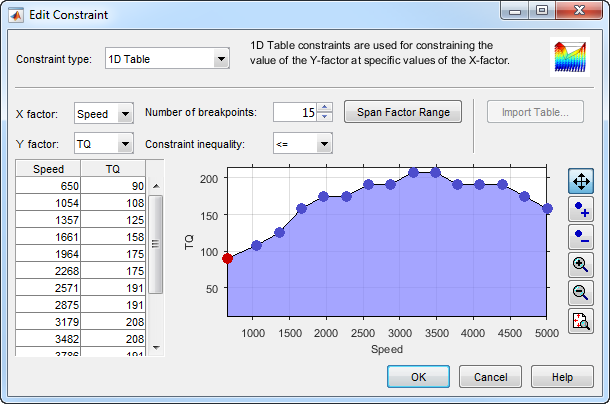 В диалоговом окне Constraints Manager выберите каждое ограничение крутящего момента в свою очередь и нажмите Edit. Наблюдайте максимум, и ограничения минимального крутящего момента задают верхнюю и нижнюю границу выполнимого рабочего диапазона. Эти ограничения были разработаны до этого проекта в начальном широко открытом дросселе и тестировании производительности двигателя закрытого дросселя.