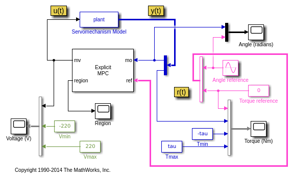 В этом примере показано, как использовать явный MPC, чтобы управлять сервомеханизмом DC под напряжением, и вал закручивают ограничения.