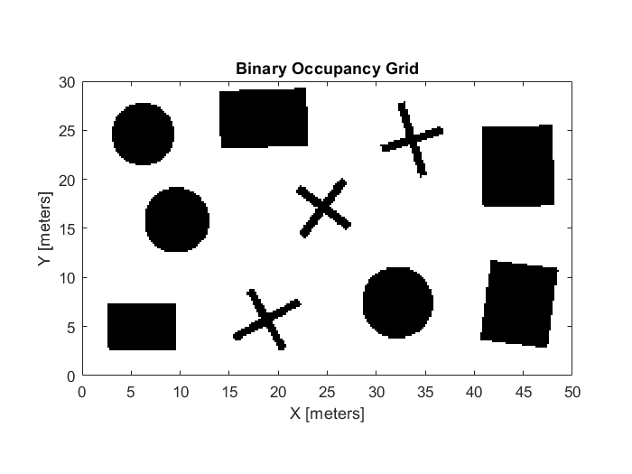 генерирует 2D карту заполнения как map = mapClutterbinaryOccupancyMap объект map, с шириной и высотой 50 метров и разрешением 5 ячеек на метр. Карта содержит 20 случайным образом распределенных препятствий типов Box и Circle. Сгенерированные препятствия имеют случайные размеры.