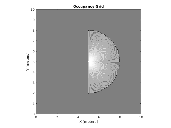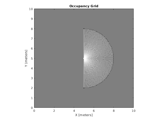 occupancyMap создает 2D объект карты сетки заполнения. Каждая ячейка в сетке заполнения имеет значение, представляющее вероятность заполнения той ячейки. Значения близко к 1 представляют высокую вероятность, что ячейка содержит препятствие. Значения близко к 0 представляют высокую вероятность, что ячейка не занята и свободное препятствие.
