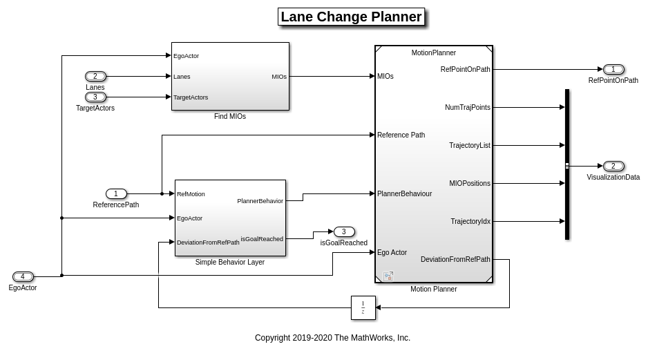 Смоделируйте планировщика изменения маршрута: образец модели содержит простой слой поведения и планировщика движения. Слой поведения конфигурирует планировщика движения, чтобы сгенерировать оптимальную траекторию путем рассмотрения информации о MIO.