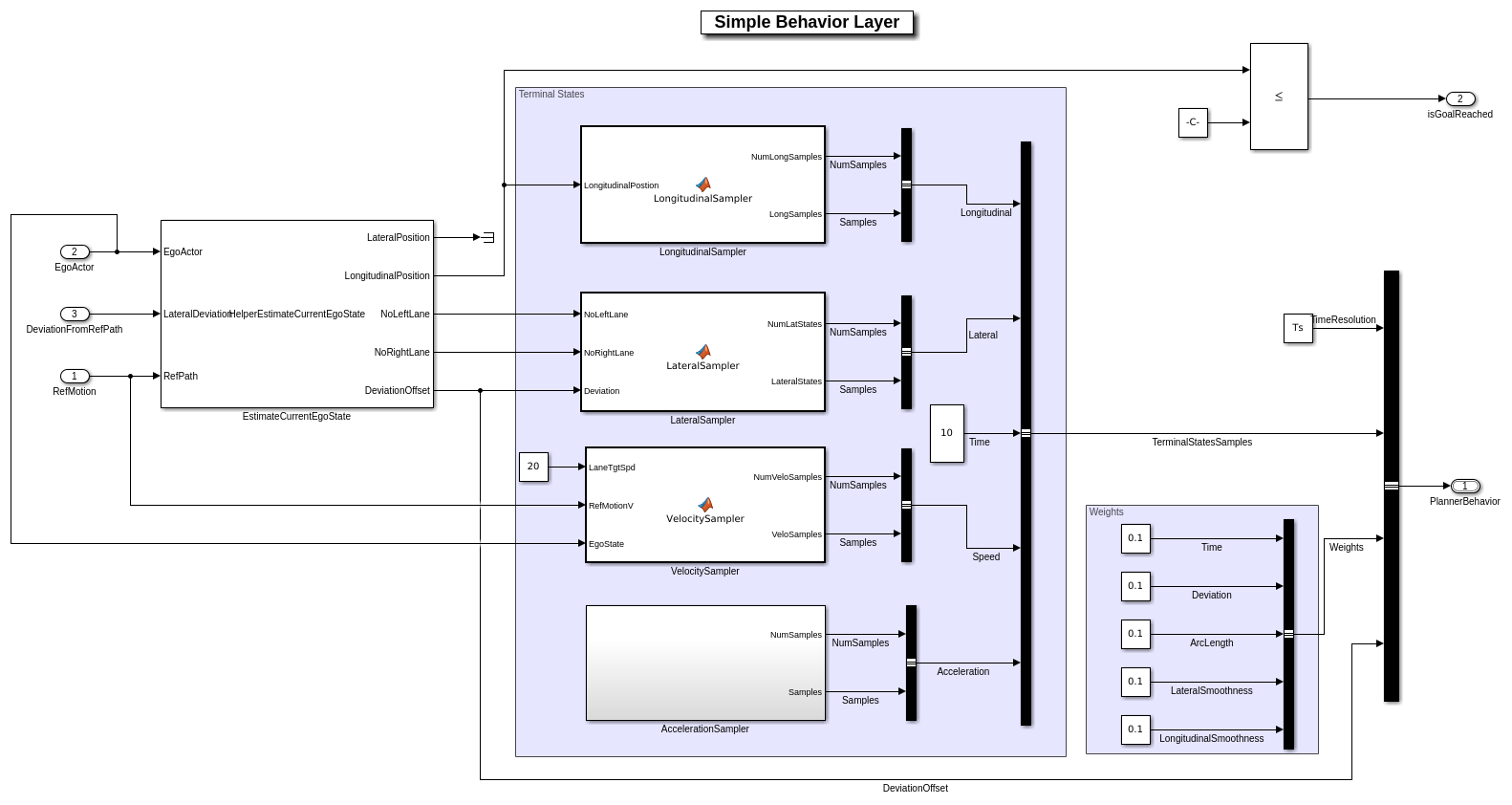 Простая подсистема Слоя Поведения конфигурирует поведение планировщика путем вычисления конечных состояний, весов и значений отклонения с помощью текущей информации о состоянии автомобиля, оборудованного датчиком. Откройте Простую подсистему Слоя Поведения.