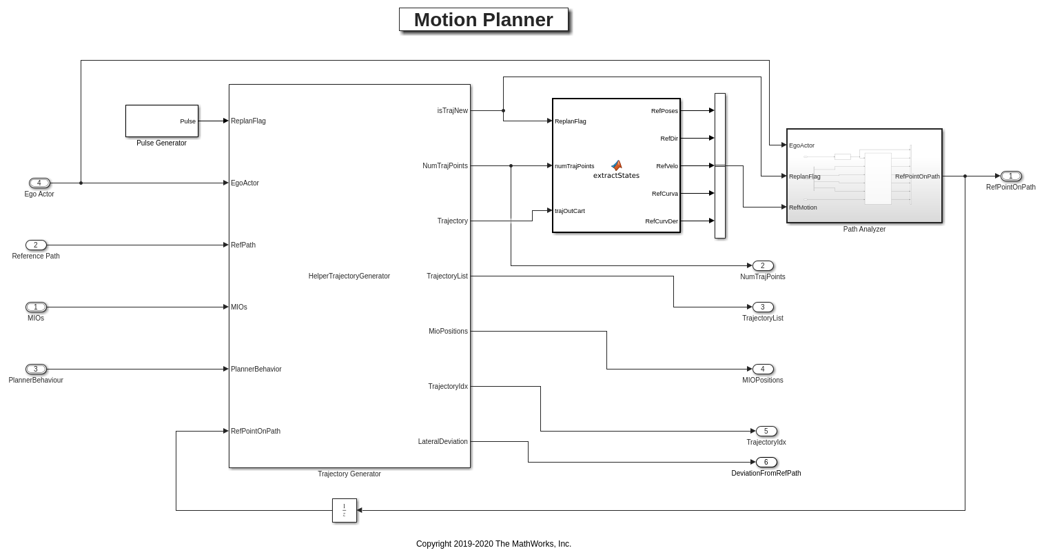 Образец модели Планировщика Движения генерирует траекторию при помощи поведения планировщика, информации о сценарии и информации о MIO. Откройте образец модели Планировщика Движения.
