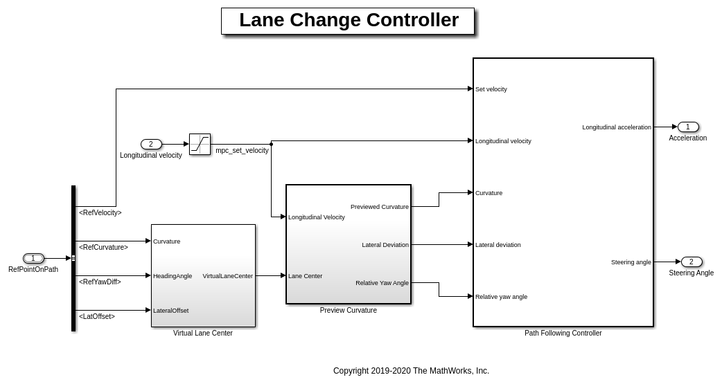 Образец модели Контроллера Изменения Маршрута симулирует механизм управления следования траектории, который сохраняет автомобиль, оборудованный датчиком, перемещающийся вдоль сгенерированной траектории при отслеживании скорости набора. Для этого контроллер настраивает и продольное ускорение и передний руководящий угол автомобиля, оборудованного датчиком. Контроллер вычисляет действия оптимального управления в то время как удовлетворяющая скорость, ускорение и держащиеся угловые ограничения с помощью адаптивной модели прогнозирующее управление (MPC). Откройте Контроллер Изменения Маршрута образец модели.