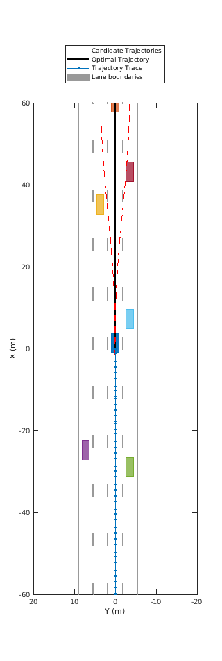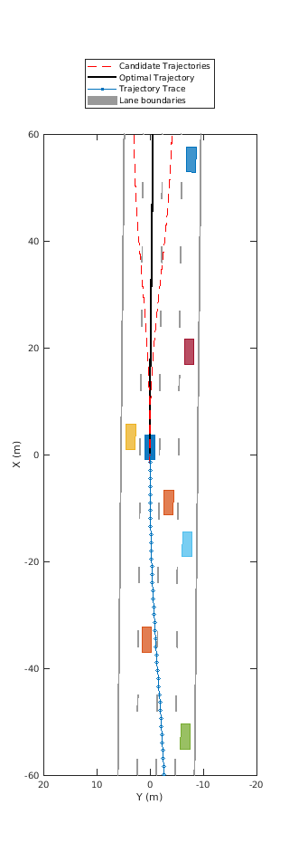 Блок Trajectory Generator генерирует оптимальную траекторию на основе MIOs, ссылочного пути и заданного поведения планировщика. Этот блок использует системный объект, HelperTrajectoryGenerator, сгенерировать необходимую траекторию. Этот Системный объект реализован с помощью trajectoryOptimalFrenet. Это использует обновленное использование информации MIO блока проверки допустимости состояния. Несколько выборок траектории подтверждены для динамического столкновения с помощью блока проверки допустимости состояния, и оптимальная траектория идентифицирована.
