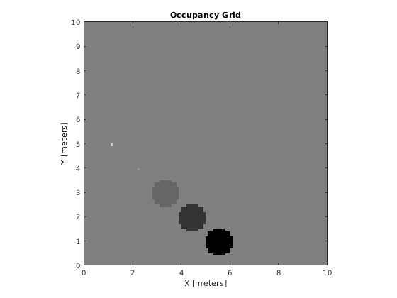x = [1.2; 2.3; 3.4; 4.5; 5.6]; y = [5.0; 4.0; 3.0; 2.0; 1.0]; pvalues = [0.2 0.4 0.6 0.8 1]; updateOccupancy(map,[x y],pvalues) figure show(map)