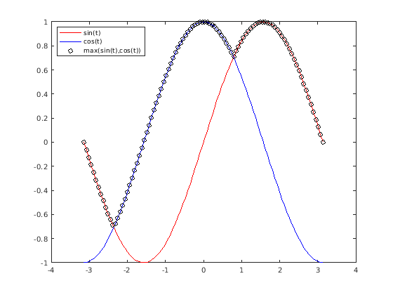 t = linspace(-pi,pi); plot(t,sin(t),'r-') hold on plot(t,cos(t),'b-'); plot(t,max(sin(t),cos(t)),'ko') legend('sin(t)','cos(t)','max(sin(t),cos(t))','Location','NorthWest')