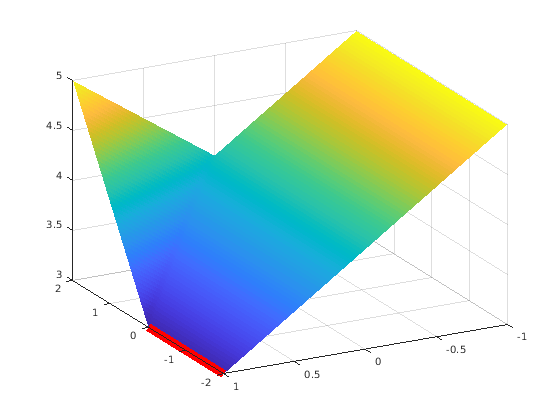 [X,Y] = meshgrid(linspace(-2,2),linspace(-1,1)); Z = max(fun([X(:),Y(:)]),[],2); Z = reshape(Z,size(X)); surf(X,Y,Z,'LineStyle','none') view(-118,28) hold on line([-2,0],[1,1],[3,3],'Color','r','LineWidth',8) hold off