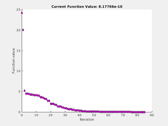 fminsearch не предпочтительный решатель для проблем, которые являются суммами квадратов, то есть, формы