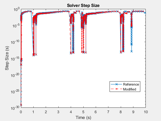 h2 = figure; semilogy(timeRef(1:end-1),diff(timeRef),'-x',... 'LineWidth',1,'MarkerSize',7) hold on semilogy(tout(1:end-1),diff(tout),'--x','Color','r',... 'LineWidth',.1,'MarkerSize',5) title('Solver Step Size') xlabel('Time (s)') ylabel('Step Size (s)') h1Leg = legend({'Reference','Modified'},'Location','best');