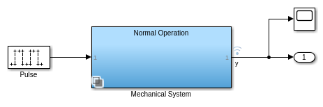 set_param([sysA,'/Mechanical System'],'OverrideUsingVariant','DamagedSystem'); set_param([sysA,'/Pulse'],'Period','5120') % to force only one bump sim(sysA) y = logsout.getElement('y').Values;