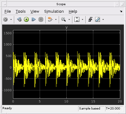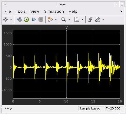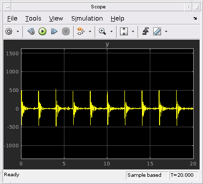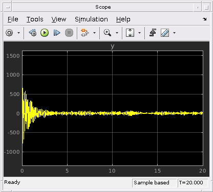 Поместите модель Simulink в вариант поврежденной системы и симулируйте. Мы используем один удар, как введено, поскольку остаточному тесту нужен белый вход с возможно переходным процессом вследствие начальных условий.