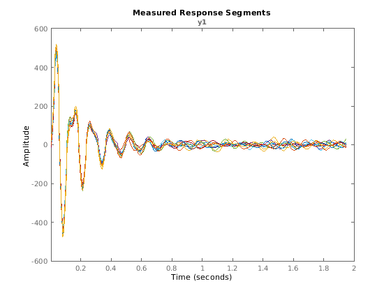 Ts = 1/256; % data sample time nr = 10; % number of bumps in the signal N = 512; % length of data between bumps znormal = cell(nr,1); for ct = 1:nr ysegment = ynormal.Data((ct-1)*N+(1:500)); z = iddata(ysegment,[],Ts); znormal{ct} = z; % each segment has only one bump end plot(znormal{:}) % plot a sampling of the recorded segments title('Measured Response Segments')