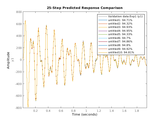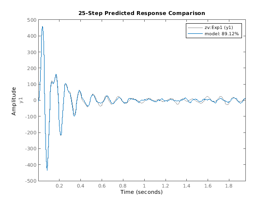 График показывает, что модель может предсказать ответ в первом эксперименте набора данных валидации 25 временных шагов (= 0,1 секунды) в будущем с> 85%-я точность. Чтобы просмотреть подгонку к другим экспериментам в наборе данных, используйте контекстное меню щелчка правой кнопкой осей графика.