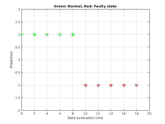 set_param([sysA,'/Mechanical System'],'OverrideUsingVariant','DeterioratingSystem'); sim(sysA) ytv = logsout.getElement('y').Values; ytv = squeeze(ytv.Data); PredictedMode = cell(nr,1); for ct = 1:nr zSegment = iddata(ytv((ct-1)*512+(1:500)),[],Ts); mSegment = ssest(zSegment, nx, 'form', 'canonical', 'Ts', Ts); PredictedMode(ct) = predict(cl, plist(esort(pole(mSegment)))); end I = strcmp(PredictedMode,'good'); Tags = ones(nr,1); Tags(~I) = -1; t = (0:5120)'*Ts; % simulation time Time = t(1:512:end-1); plot(Time(I),Tags(I),'g*',Time(~I),Tags(~I),'r*','MarkerSize',12) grid on axis([0 20 -2 2]) title('Green: Normal, Red: Faulty state') xlabel('Data evaluation time') ylabel('Prediction')