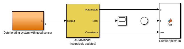 Рассмотрите сценарий износа снова. Как системные возрасты, существует больший "грохот", который проявляется как возбуждение нескольких резонирующих режимов, а также повышение максимальной чувствительности системы. Этот сценарий описан в модели pdmDeterioratingSystemEstimation который является тем же самым как режим 'DeterioratingSystem' pdmMechanicalSystem за исключением того, что импульсивные удары, которые были добавлены для оффлайновой идентификации, не присутствуют. Ответ системы передается блоку "Recursive Polynomial Model Estimator", который был сконфигурирован, чтобы оценить параметры структуры модели ARMA. Фактическая система запускается в здоровом состоянии, но ухудшается к условиям конца жизненного цикла по отрезку времени 200 секунд.