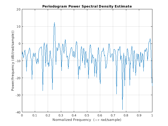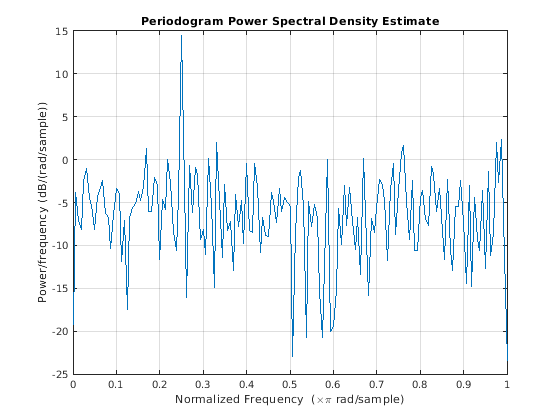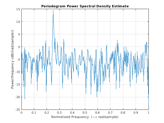 Получите периодограмму входного сигнала, состоящего из синусоиды дискретного времени с угловой частотой π/4 радианы/выборка с дополнением N(0,1) белый шум. Используйте длину ДПФ, равную длине сигнала.
