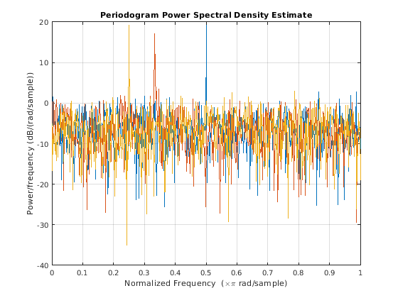 pxx = periodogram(x) возвращает оценку степени спектральной плотности (PSD) периодограммы, pxx, из входного сигнала, x, найденное использование прямоугольного окна. Когда x вектор, он обработан как один канал. Когда x матрица, PSD вычисляется независимо для каждого столбца и хранится в соответствующем столбце pxx. Если x с действительным знаком, pxx односторонняя оценка PSD. Если x с комплексным знаком, pxx двухсторонняя оценка PSD. Число точек, nfft, в дискретном преобразовании Фурье (DFT) максимум 256 или следующая степень двойки, больше, чем длина сигнала.