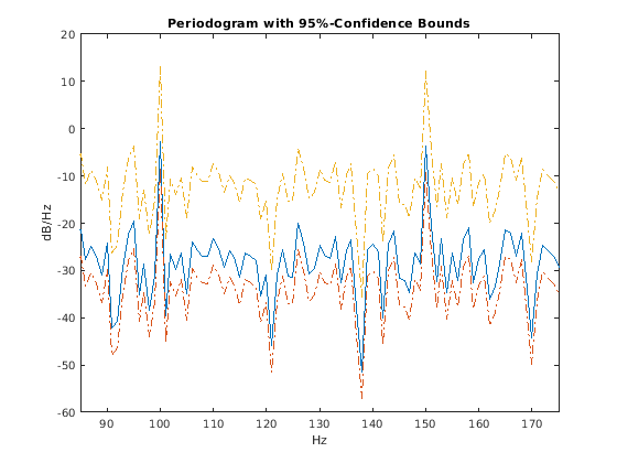 Получите периодограмму оценка PSD с 95%-доверительными-границами. Постройте периодограмму наряду с доверительным интервалом и увеличьте масштаб необходимой области частоты около 100 и 150 Гц.