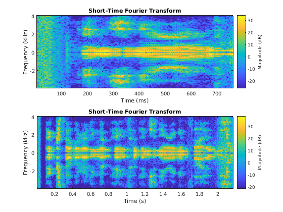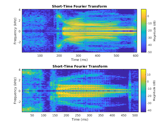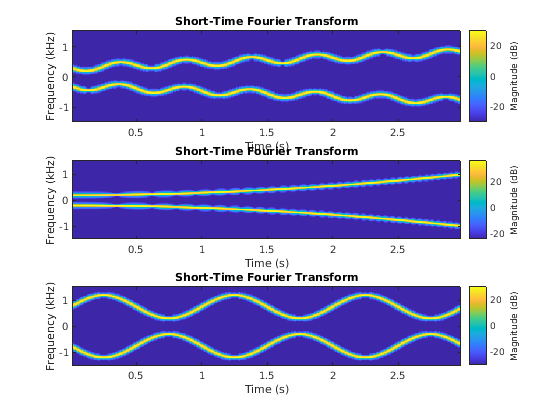 plotID = 1; while hasdata(sds) [dataOut,info] = read(sds); subplot(3,1,plotID) stft(dataOut,info.SampleRate) plotID = plotID + 1; end