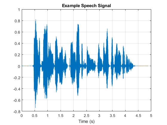 figure t = (1/adsTrainInfo.SampleRate) * (0:numel(audio)-1); plot(t,audio) title("Example Speech Signal") xlabel("Time (s)") grid on