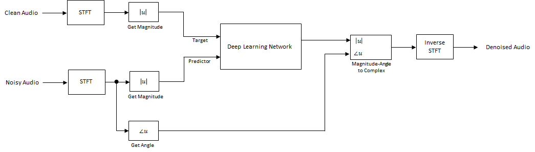 Основной план подготовки глубокого обучения показывают ниже. Обратите внимание на то, что, поскольку речь обычно падает ниже 4 кГц, вы сначала прореживаете чистые и шумные звуковые сигналы к 8 кГц, чтобы уменьшать вычислительную загрузку сети. Предиктор и целевые сетевые сигналы являются спектрами величины шумных и чистых звуковых сигналов, соответственно. Выход сети является спектром величины сигнала denoised. Сеть регрессии использует вход предиктора, чтобы минимизировать среднеквадратичную погрешность между ее выходом и входной целью. denoised аудио преобразовано назад в область времени использование выходного спектра величины и фазы сигнала с шумом [2].