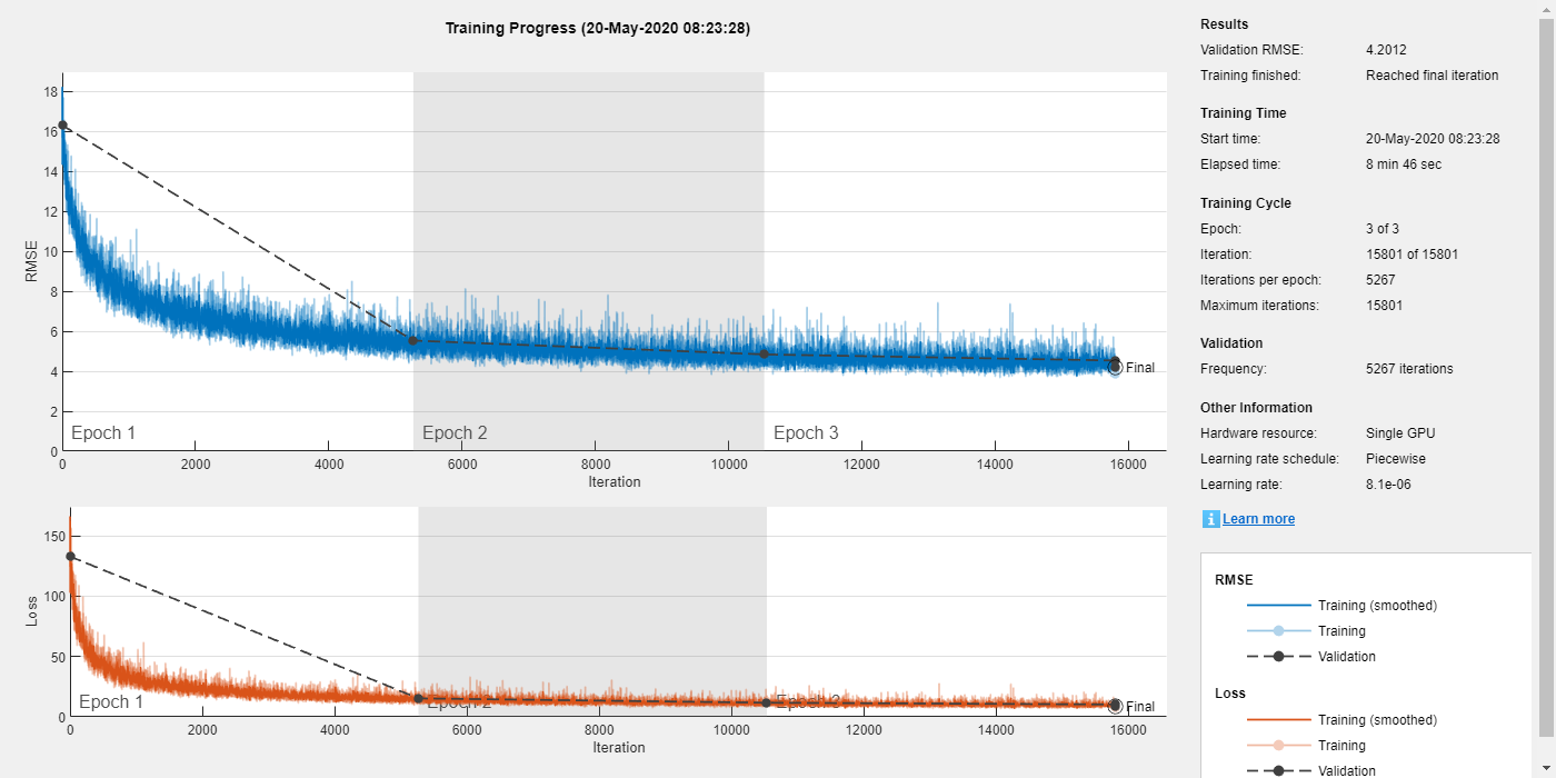 options = trainingOptions("adam", ... "MaxEpochs",3, ... "InitialLearnRate",1e-5, ... "MiniBatchSize",miniBatchSize, ... "Shuffle","every-epoch", ... "Plots","training-progress", ... "Verbose",false, ... "ValidationFrequency",floor(size(trainPredictors,4)/miniBatchSize), ... "LearnRateSchedule","piecewise", ... "LearnRateDropFactor",0.9, ... "LearnRateDropPeriod",1, ... "ValidationData",{validatePredictors,permute(validateTargets,[3 1 2 4])});