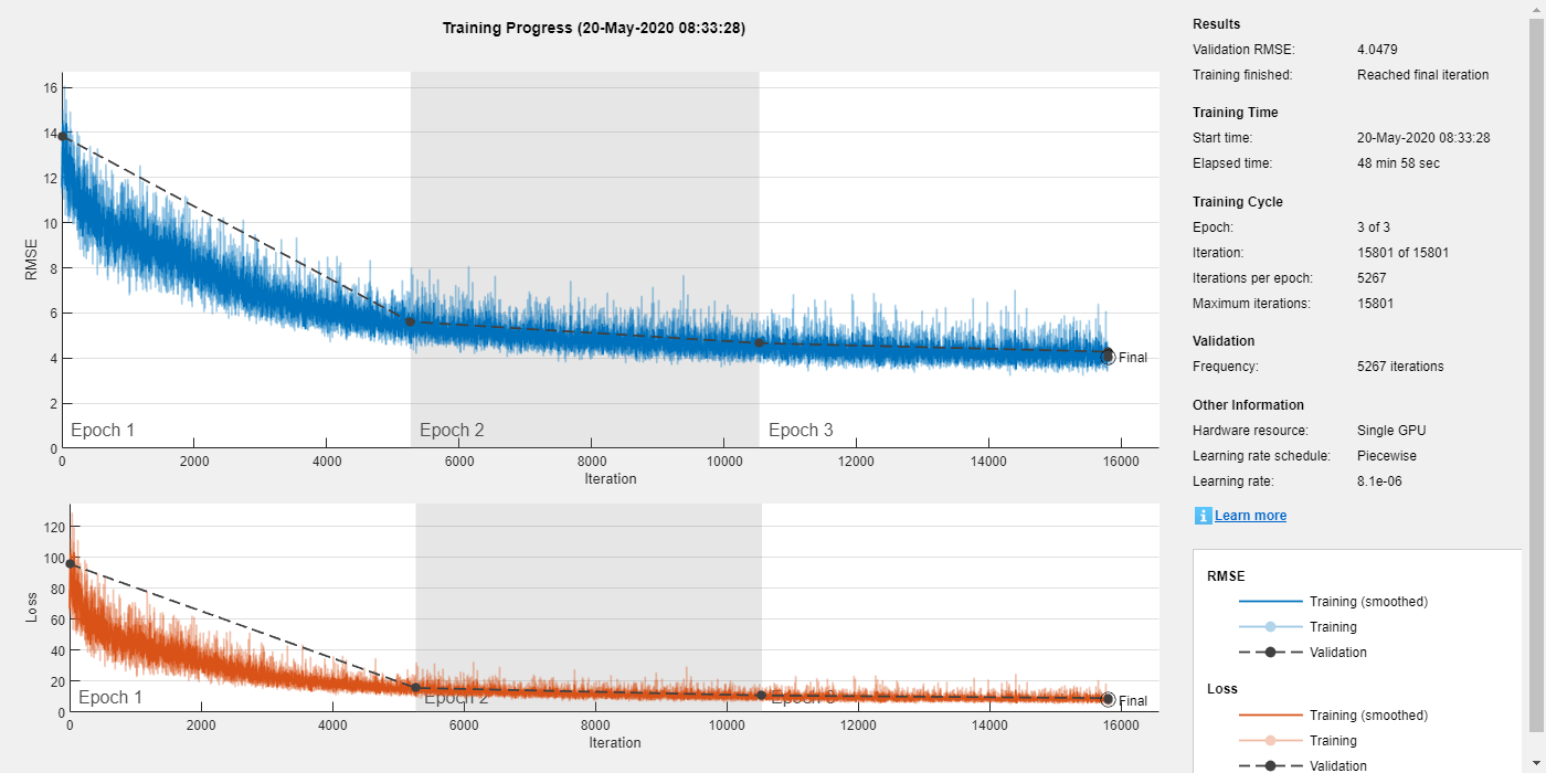 miniBatchSize = 128; options = trainingOptions("adam", ... "MaxEpochs",3, ... "InitialLearnRate",1e-5,... "MiniBatchSize",miniBatchSize, ... "Shuffle","every-epoch", ... "Plots","training-progress", ... "Verbose",false, ... "ValidationFrequency",floor(size(trainPredictors,4)/miniBatchSize), ... "LearnRateSchedule","piecewise", ... "LearnRateDropFactor",0.9, ... "LearnRateDropPeriod",1, ... "ValidationData",{validatePredictors,validateTargets});