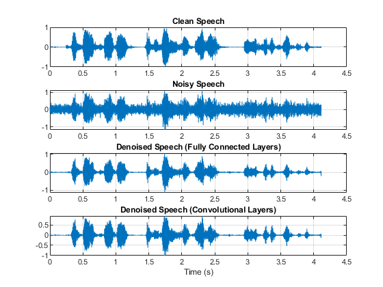 t = (1/fs) * (0:numel(denoisedAudioFullyConnected)-1); figure subplot(4,1,1) plot(t,cleanAudio(1:numel(denoisedAudioFullyConnected))) title("Clean Speech") grid on subplot(4,1,2) plot(t,noisyAudio(1:numel(denoisedAudioFullyConnected))) title("Noisy Speech") grid on subplot(4,1,3) plot(t,denoisedAudioFullyConnected) title("Denoised Speech (Fully Connected Layers)") grid on subplot(4,1,4) plot(t,denoisedAudioFullyConvolutional) title("Denoised Speech (Convolutional Layers)") grid on xlabel("Time (s)")