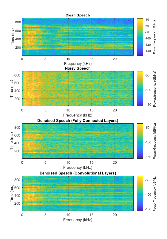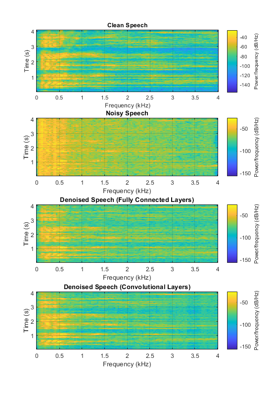 h = figure; subplot(4,1,1) spectrogram(cleanAudio,win,overlap,ffTLength,fs); title("Clean Speech") grid on subplot(4,1,2) spectrogram(noisyAudio,win,overlap,ffTLength,fs); title("Noisy Speech") grid on subplot(4,1,3) spectrogram(denoisedAudioFullyConnected,win,overlap,ffTLength,fs); title("Denoised Speech (Fully Connected Layers)") grid on subplot(4,1,4) spectrogram(denoisedAudioFullyConvolutional,win,overlap,ffTLength,fs); title("Denoised Speech (Convolutional Layers)") grid on p = get(h,'Position'); set(h,'Position',[p(1) 65 p(3) 800]);