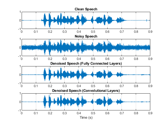 [cleanAudio,noisyAudio,denoisedAudioFullyConnected,denoisedAudioFullyConvolutional] = testDenoisingNets(adsTest,denoiseNetFullyConnected,denoiseNetFullyConvolutional,noisyMean,noisyStd,cleanMean,cleanStd);