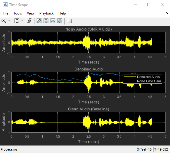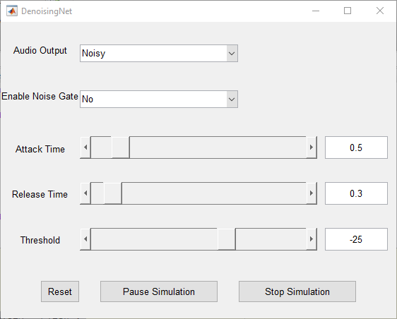 speechDenoisingRealtimeApp запускает Пользовательский интерфейс (UI), спроектированный, чтобы взаимодействовать с симуляцией. Пользовательский интерфейс позволяет настройкам параметров, и результаты отражаются в симуляции немедленно. Можно также позволить/запретить подавитель шума, который управляет на denoised выходом, чтобы далее уменьшать шум, а также настроить время атаки, время релиза и порог подавителя шума. Можно слушать шумное, чистое или denoised аудио от пользовательского интерфейса.