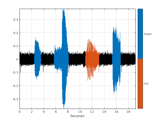 mvals = getLabelValues(whalesongs,2,'MoanRegions'); mvals.Value = categorical(repmat("moan",size(mvals,1),1)); tvals = getLabelValues(whalesongs,2,'TrillRegions'); tvals.Value = categorical(repmat("trill",size(tvals,1),1)); msk = signalMask([mvals;tvals],'SampleRate',1/seconds(t(2)-t(1))); plotsigroi(msk,sng)