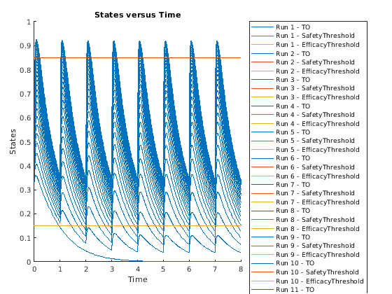 d = getdose(m1,'Daily Dose');Добавьте два скаляра observables, которые представляют пороги безопасности и эффективности для TO. В этом примере предположите что любой TO значение выше 0.85 небезопасно, и любой TO значение ниже 0.15 не имеет никакой эффективности.