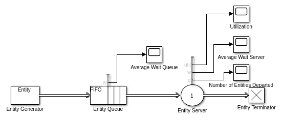 Выходной порт, w, представляя среднюю длительность, что сущности ожидают в очереди appears.Connect статистическая величина с блоком scope и переименовывают ее в Очередь Average Wait.