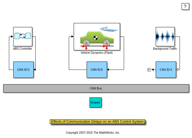 В этом примере показано, как стохастические сетевые причины трафика, синхронизирующие задержку и неопределенность в антиблокировочной тормозной системе (ABS), которая использует коммуникации Сети области управления (CAN). Модель является представительной для реальной загруженной в большой степени сети и также иллюстрирует проблемно-ориентированную модель распределенной системы. Включением реальных эффектов синхронизации в модели вы завоевываете доверие о поведении и робастности вашего проекта, прежде чем вы протестируете его в оборудовании.