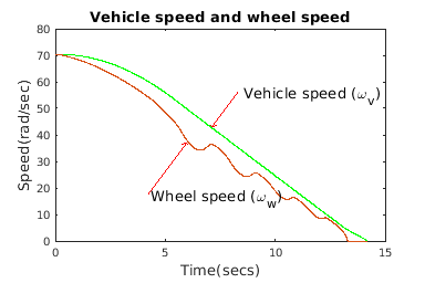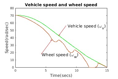 Мы начинаем с идеального сценария антиблокировочной тормозной системы с помощью коммуникаций CAN без фонового трафика. В этой модели мы симулируем CAN без фонового трафика путем ручной установки выхода Ручного Переключателя, который содержится в фоновом режиме блок подсистемы Трафика к позиции "OFF", прежде, чем запустить симуляцию. В этом идеальном сценарии программное обеспечение симулирует систему связи с устойчивым уровнем сетевого использования в зависимости от времени и без задержек доставки сообщений. Эти идеальные условия приводят к превосходному ответу промаха от системы ABS относительно уменьшающейся скорости колеса.