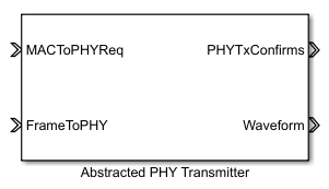 Abstracted PHY Transmitter блок моделирует цепь передачи физического уровня. Этот блок использует систему координат и соответствующие параметры передачи от слоя MAC. Параметры как степень передачи, длительность преамбулы, длительность заголовка и длительность полезной нагрузки вычисляются в блоке. Эта информация передается наряду с системой координат MAC как метаданные, чтобы симулировать передачу формы волны.
