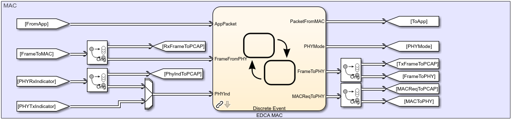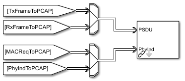 Скопировать входные сущности слоя MAC (получил A-MPDUs, FrameToMAC, и PhyRxIndicator вектор) и выходные сущности (передал A-MPDUs, FrameToPHY, и MACReqToPHY вектор), используйте Entity Replicator блоки. Слой MAC обеспечивает RxFrameToPCAP, PhyIndToPCAP, TxFrameToPCAP, и MACReqToPCAP как вводит к pcapDump Блок DES.