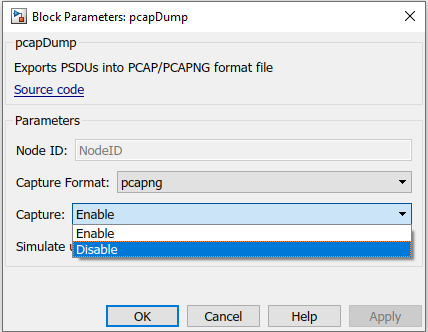 В этом примере А-МПДУ, которыми обмениваются между узлами, являются deaggregated к MPDUs в узле получения. Эти MPDUs экспортируются в пакетное получение (PCAP), и пакет получают следующее поколение (PCAPNG) файл формата с помощью pcapDump Блок DES. Использовать pcapDump Блок DES, перейдите к wlanSystemLevelComponentsLib