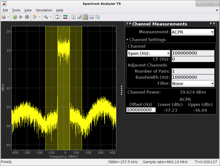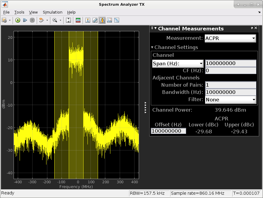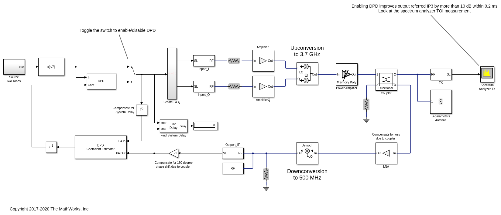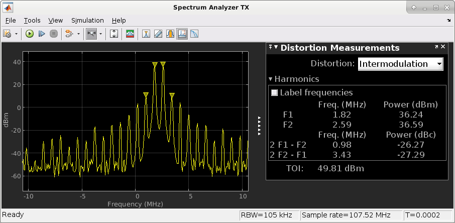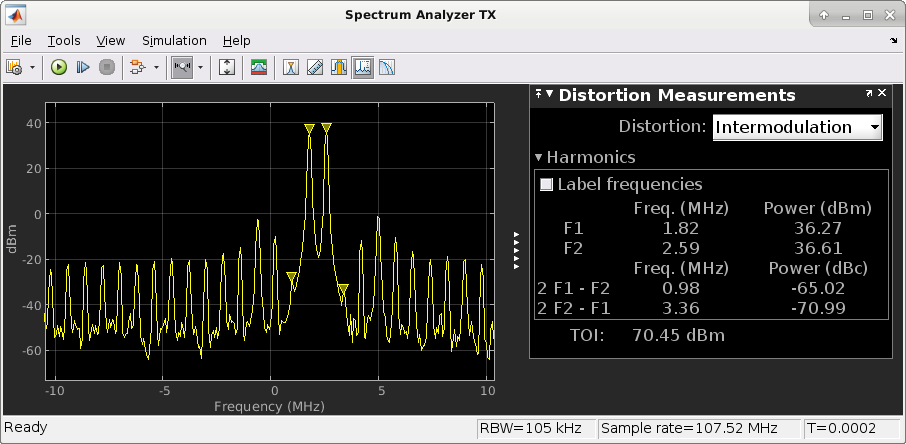 Модель включает двухцветный генератор сигнала, который используется для тестирования отнесенной к выходу точки пересечения третьего порядка системы. Модель включает повышающее преобразование в частоту RF с помощью модулятора I-Q, модели PA, разветвитель, чтобы осуществить сниффинг выхода PA и блока S-параметра, представляющего эффект загрузки антенны. Цепь приемника выполняет понижающее преобразование к низкой промежуточной частоте. Заметьте, что пропускная способность симуляции этой системы составляет 107,52 МГц.