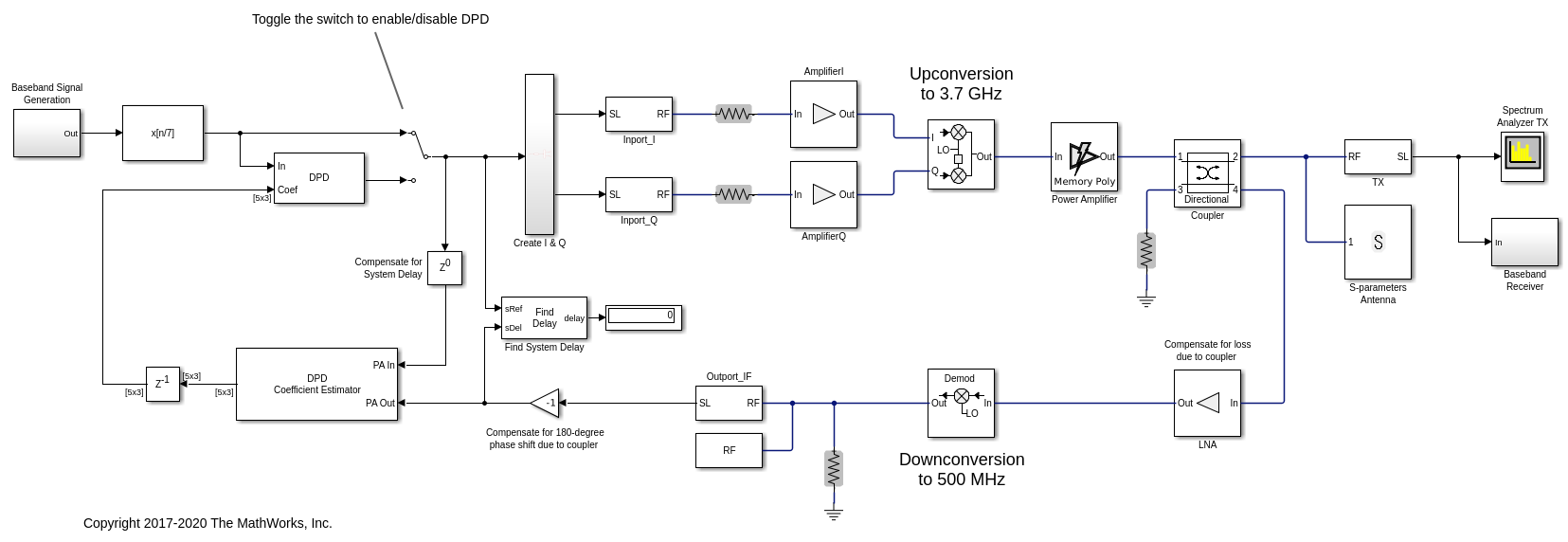 Эта демонстрация показывает пример использования цифрового предварительного искажения (DPD) в передатчике, чтобы возместить эффекты нелинейности в усилителе мощности. В этом случае мы используем модель усилителя мощности, который был получен с помощью Характеристики Усилителя мощности (Communications Toolbox). В первой симуляции передатчик RF отправляет два тона. Во второй симуляции передатчик RF отправляет подобную 5G форму волны OFDM с пропускной способностью на 100 МГц.