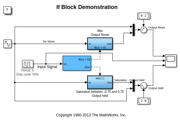 Этот пример показывает то, что происходит, когда синусоида подана в Если блок. После выполнения симуляции осциллограф показывает три графика. Этот пример спроектирован, чтобы выдержать сравнение Если блок с активированными подсистемами.
