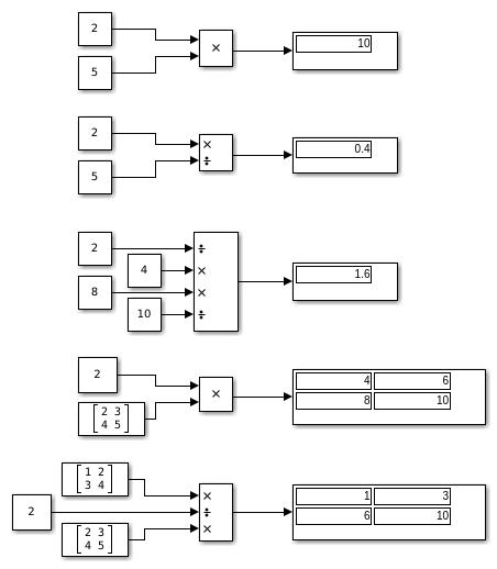 Блок имеет количество входных параметров, данных длиной вектора символов. Каждый вход, который соответствует * символ умножается в выход. Каждый вход, который соответствует / символ разделен на выход. Операции происходят в поэлементном режиме или матричном режиме, как задано параметром Умножения. Смотрите Поэлементный Режим и Матричный Режим для получения дополнительной информации.
