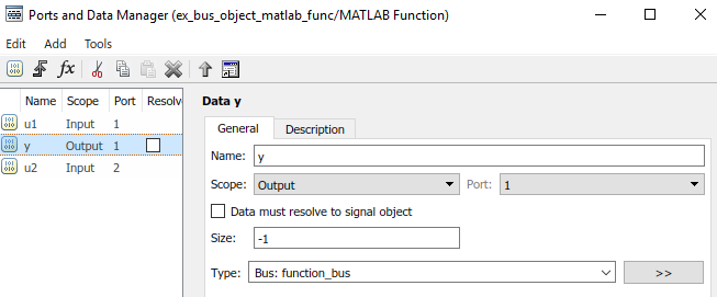 Чтобы видеть, как Bus объект задает шину, выход для блока MATLAB function, в Панели инструментов MATLAB, на вкладке Editor, нажимает Edit Data и затем нажимает y. Выход Type задан как function_bus Bus объект.