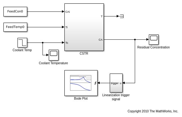 В этом примере показано, как построить линеаризацию модели Simulink при конкретных условиях в процессе моделирования. Программное обеспечение Simulink Control Design обеспечивает блоки, которые можно добавить в модели Simulink, чтобы вычислить и построить линейные системы в процессе моделирования. В этом примере линейная система непрерывно размешиваемого химического реактора вычислена и построена на Диаграмме Боде как реакторные переходы через различные рабочие точки.