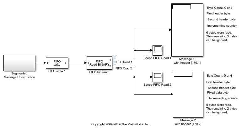 Эта модель показывает способность блока FIFO Read BINARY обработать сообщения, которые прерваны и только частично завершенные. Это - худший пример случая, где каждое сообщение прервано.