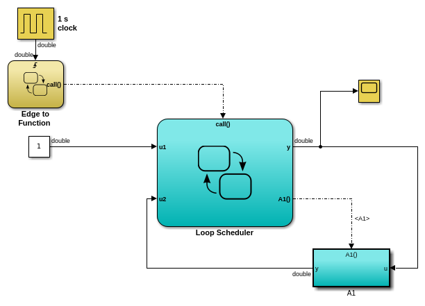 Когда вы симулируете модель, график Вызывающей стороны диспетчеризирует все четыре выходных события во время t = 1. График Вызываемого выполняется четыре раза во время того временного шага. Выполнение графика Вызываемого чередовано с выполнением графика Вызывающей стороны так, чтобы выведенный из графика Вызываемого было сразу доступно. В результате значение | y | увеличивается с 0 до 4 во время t = 1.